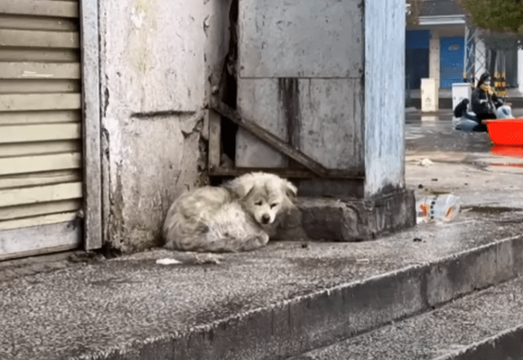 As we were leaving the market one evening, a sight caught our eyes and froze us in our tracks. A dog lay collapsed in front of the library, her frail body pressed against the side of an old electrical cabinet.