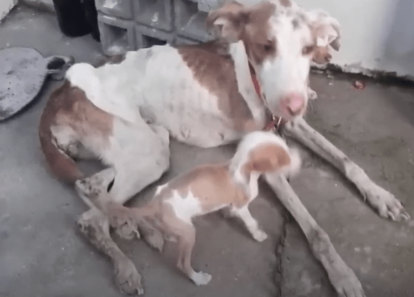 The mother was emaciated, her ribs pushing sharply through her skin. Around her neck hung an old, rusted iron chain, far too heavy for her fragile frame. She had been abandoned, left to fend for herself and her newborns in a world that showed her no mercy. And yet, despite her suffering, she had not given up. She sat there calmly, watching us approach. Instead of growling or shrinking back, she wagged her tail slowly and even managed to give us a small, reassuring lick, as if to say, “It’s all right. I trust you.”