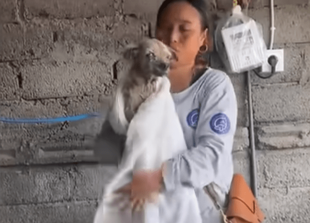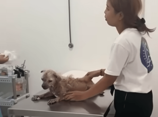 The children had seen him lying there for days. “A man left him and walked away,” they told us. When I arrived, I found the dog exactly as they described—curled on the cold ground, his body trembling, his gaze vacant and sad. He looked like he had already given up. His eyes seemed unable to see, and most of his fur had fallen out. The little that remained clung in rough patches, leaving his skin exposed, scaly, and itchy. When I reached out and touched him, he did not react at all.