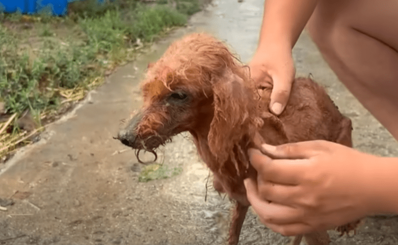 The sight was unbearable. She looked so small, so broken, as if life itself had already given up on her. Every bone in her body showed through her dirty, wet fur, her ribs stretching taut against her thin frame. Her eyes carried the hollow look of a soul who had survived too many storms alone. It was the rainy season, and no one knew how many nights she had endured like this, trembling in the cold, hiding from thunder, waiting for dawn without shelter, without comfort, without a single hand to help.