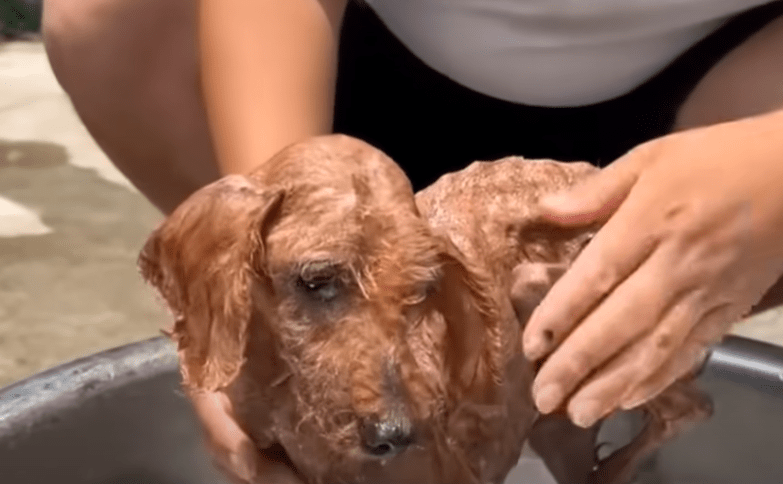 After shaving, we gave her a medicated bath. Mira trembled throughout, not out of defiance but fear. The water ran off dark and murky, carrying away dirt, parasites, and sadness. We rinsed her again and again until the water finally cleared. When she was lifted out and dried with a soft towel, she looked cleaner, calmer, almost like a new dog.