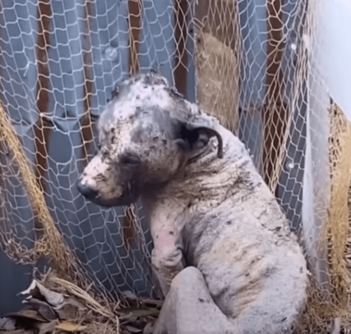 There, in the backyard, lay a dog who looked more like a lifeless body than a living creature. His frame was so thin it seemed as if the wind could carry him away. He leaned against a rusting sheet of metal, his chest rising and falling with shallow, desperate breaths.