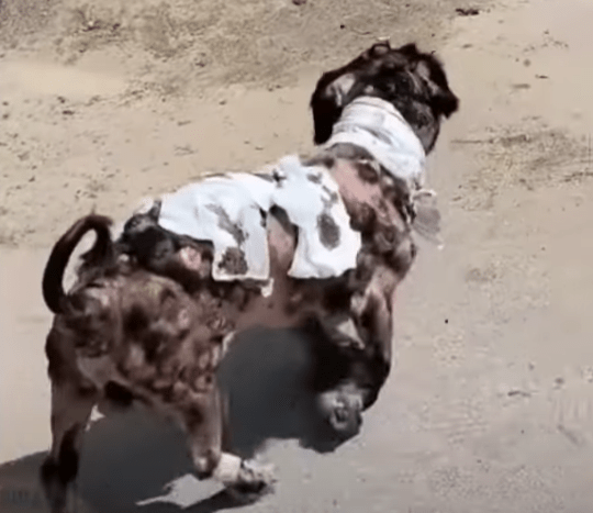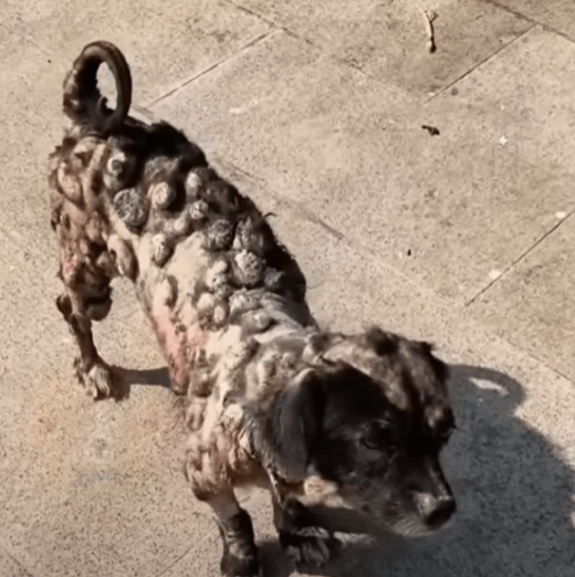 At first glance, we thought he was like many others—just another stray, thin, dirty, and starved. But as we drew closer, the picture sharpened, and what we saw stopped us cold. His body was not just frail; it was covered in dozens, perhaps hundreds, of tumors. They were everywhere—bulging from his neck, his legs, his belly, his back. Some were grotesquely large, distorting his body’s shape. Others had ulcerated, broken open, oozing foul-smelling infection that carried the sickening stench of rotting flesh. Dried blood and pus clung to his skin, painting a picture of unimaginable suffering.