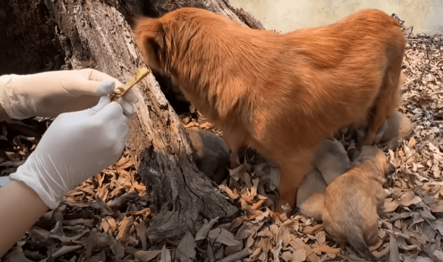 The sight broke us. Even in her weakness, even with her life hanging by a thread, her only thought was for her babies. We hurried forward, speaking softly to calm her. She staggered but did not resist when we placed water before her. She sniffed, then lapped it greedily, the sound of her tongue hitting the bowl almost frantic. Between sips, she looked back at her puppies, as though making sure they were safe.